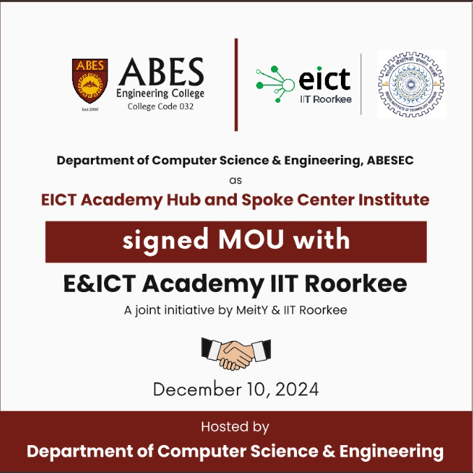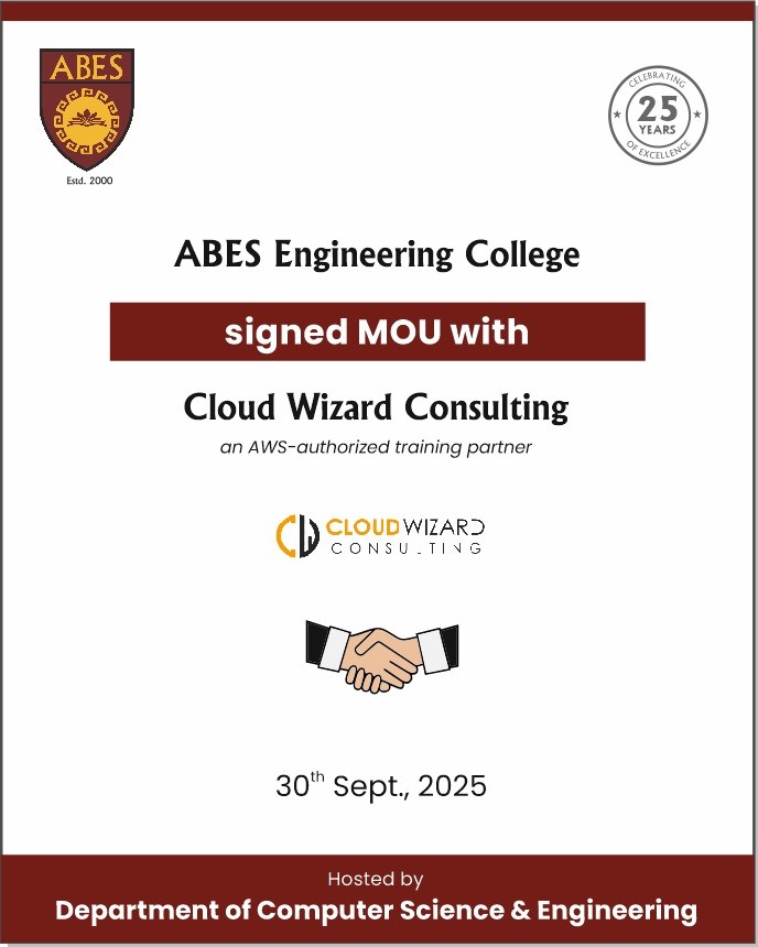 The Department of Computer Science and Engineering at ABES Engineering College Ghaziabad was established in the year 2000. The department runs four year full time B.Tech program and two year full time M.Tech program in Computer Science and Engineering with total intake of 1080 students in B.Tech and 12 students in M.Tech. The B.Tech program is accredited by National Board of Accreditation (NBA). The department has well qualified, experienced and dynamic faculty members.